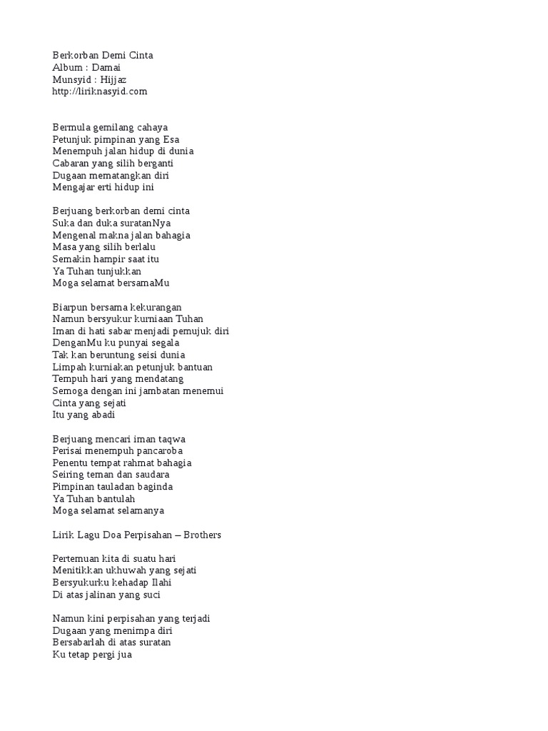 Lirik lagu BROTHERS Senin 13 Mei 2013. Semua itu karena dia. Pertemuan Kita Di Suatu Hari Menitiskan Ukhwah Yang Sejati Bersyukurku Ke Hadrat Ilahi Di Atas Jalinan Yang Suci Namun Kini Perpisahan Yang Terjadi Dugaan Yang Menimpa Diri Bersabarlah Di Atas Suratan Ku Tetap Pergi Jua Kan Ku Utuskan Salam Ingatanku Dalam Doa Kudusku Sepanjang Waktu Ya Allah Bantulah Hamba Mu Mencari Hidayah Daripada Mu.